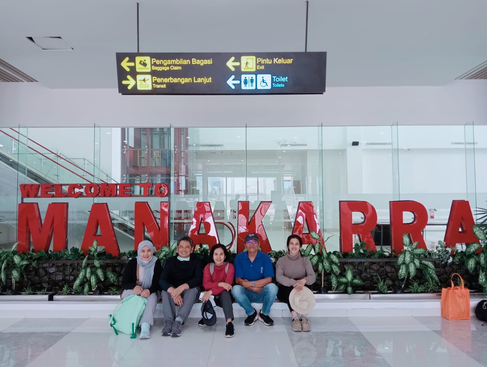 Sampai di dalam gedung, kami langsung menuju ke bagian bagasi. Sambil menunggu koper datang, kami berlima berfoto bersama di depan tulisan “Welcome to Manakarra” dengan minta tolong anak muda yang kebetulan lewat.