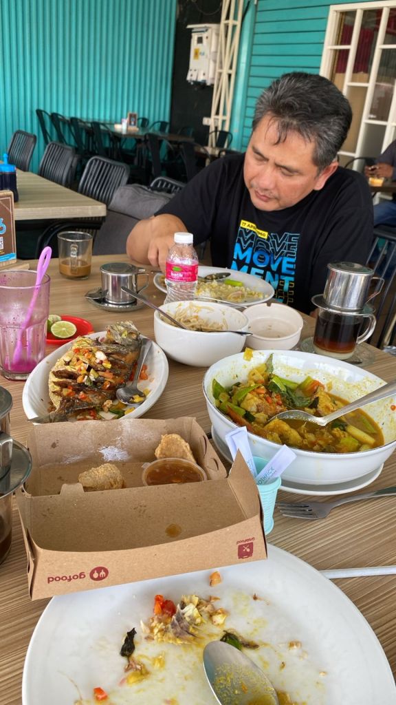 Setelah koper-koper keluar dan kardus-kardus bawaan dari Jakarta telah kami bawa, kami menuju pintu keluar. Sudah ada mobil jemputan bagi kami. Ada dua mobil, yang satu disopiri oleh Pak Nengah, yang kemudian menjadi pengantar dan penjemput kami selama di Mamuju. Karena kami kelaparan, mungkin semua belum sarapan, maka diputuskan menunggu rombongan yang dari Makassar di sebuah resto yang bernama Cilacap Cafe & Eatery. Saya memesan mie rebus dan kopi Vietnam. Beberapa teman memesan ikan atau es jus. Ternyata porsi mie rebusnya banyak sekali, walaupun lapar namun saya tidak mampu menghabiskan mie tersebut.