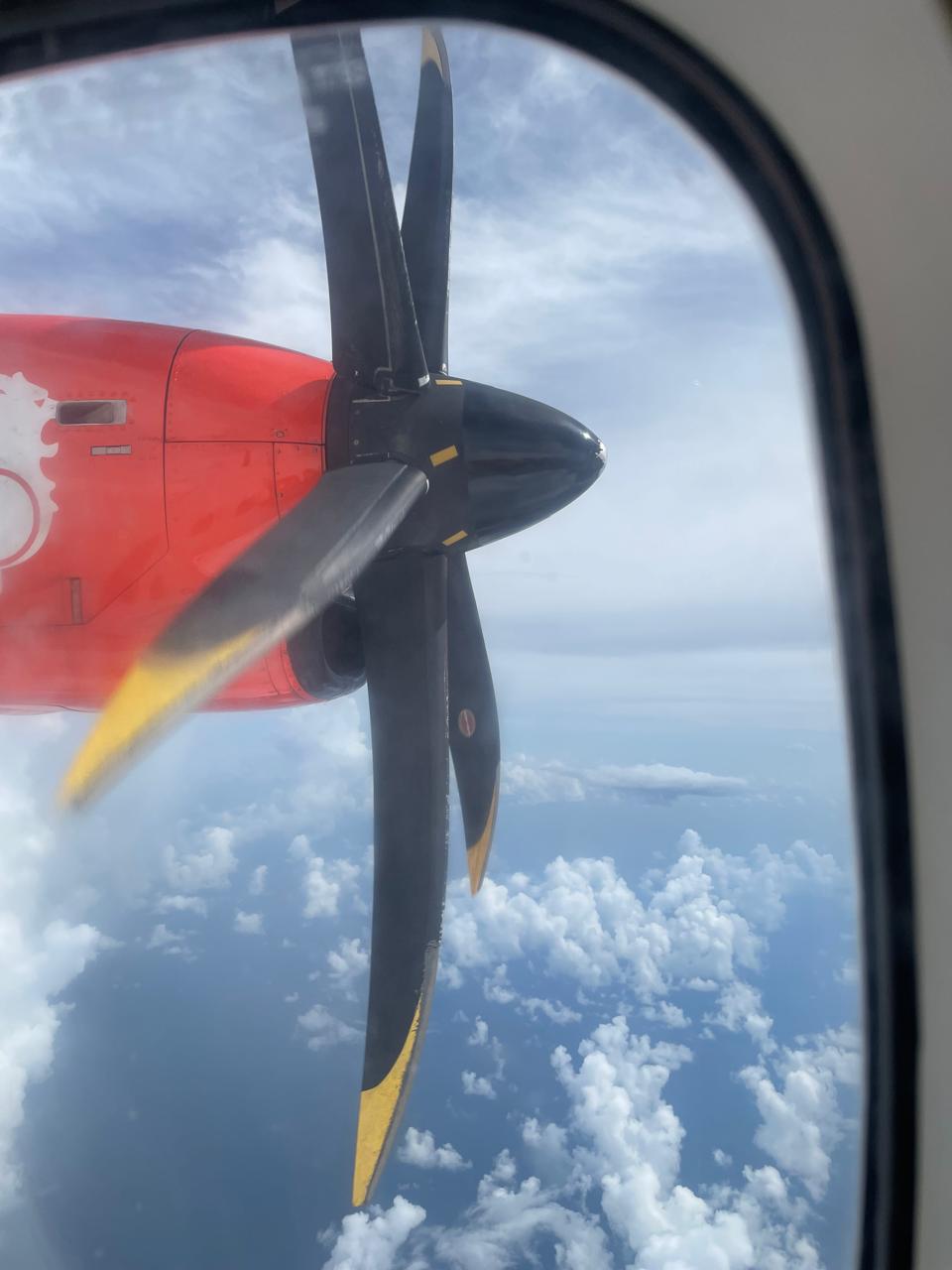 Ketika mengudara, pesawat terdengar berisik, karena baling-baling memang berada di dekat tempat duduk kami. Walaupun begitu saya tetap merasa nyaman. Karena duduk di dekat jendela, saya bisa melihat laut atau selat Makassar yang ada di bawah dengan kapal-kapal tongkang mengangkut batubara banyak sekali berjejer.